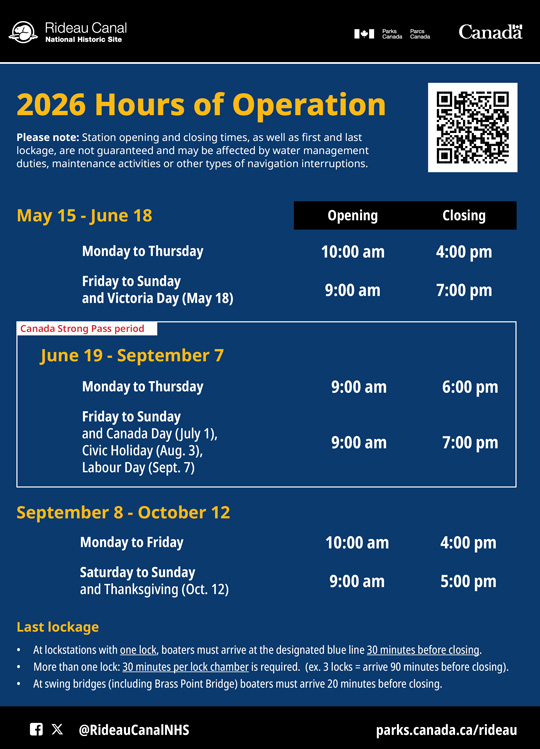 Free lockage will be available from June 19 to September 7, 2026 on the Rideau Canal. All vessels must be registered, either through a previously purchased lockage permit or through a free lockage permit, which will be provided at the first lockstation you visit.