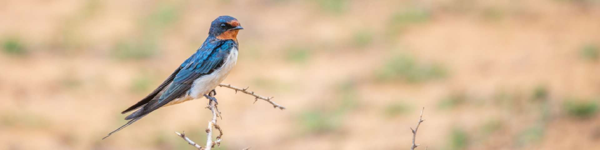 Barn swallows are medium-sized songbirds. They have a forked tail, dark-blue back and wings, chestnut throat and forehead, and beige underparts. Barn swallows search for food in open areas like grasslands, shorelines, clearings in woods, and wetlands. They love to hunt flying insects!
