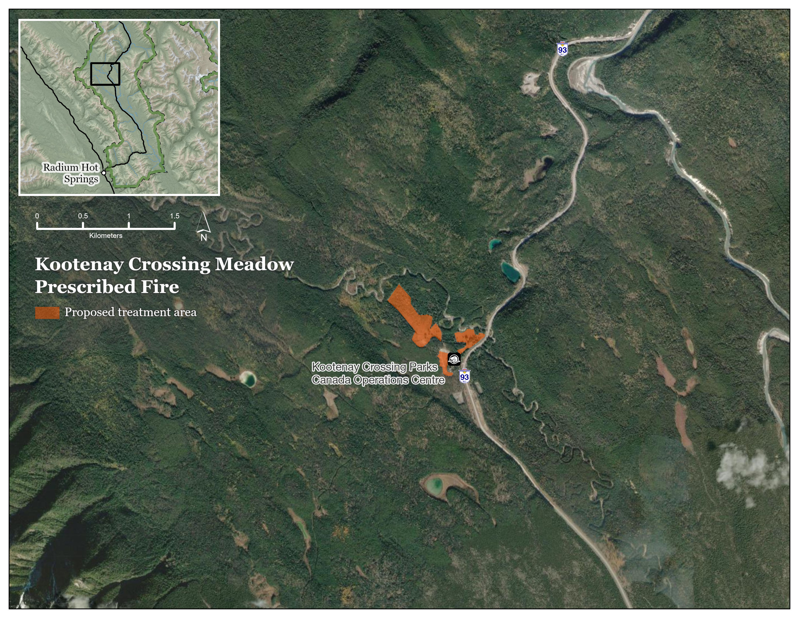 This map shows the Kootenay Crossing Meadow prescribed fire area in Kootenay National Park. The main map shows a satellite-style view. It has the treatment area shown in orange near the centre of the image. The treatment area is located beside Highway 93 South and close to the Kootenay Crossing Parks Canada Operations Centre. This map shows the surrounding landscape which includes forested valleys, and nearby river channels.