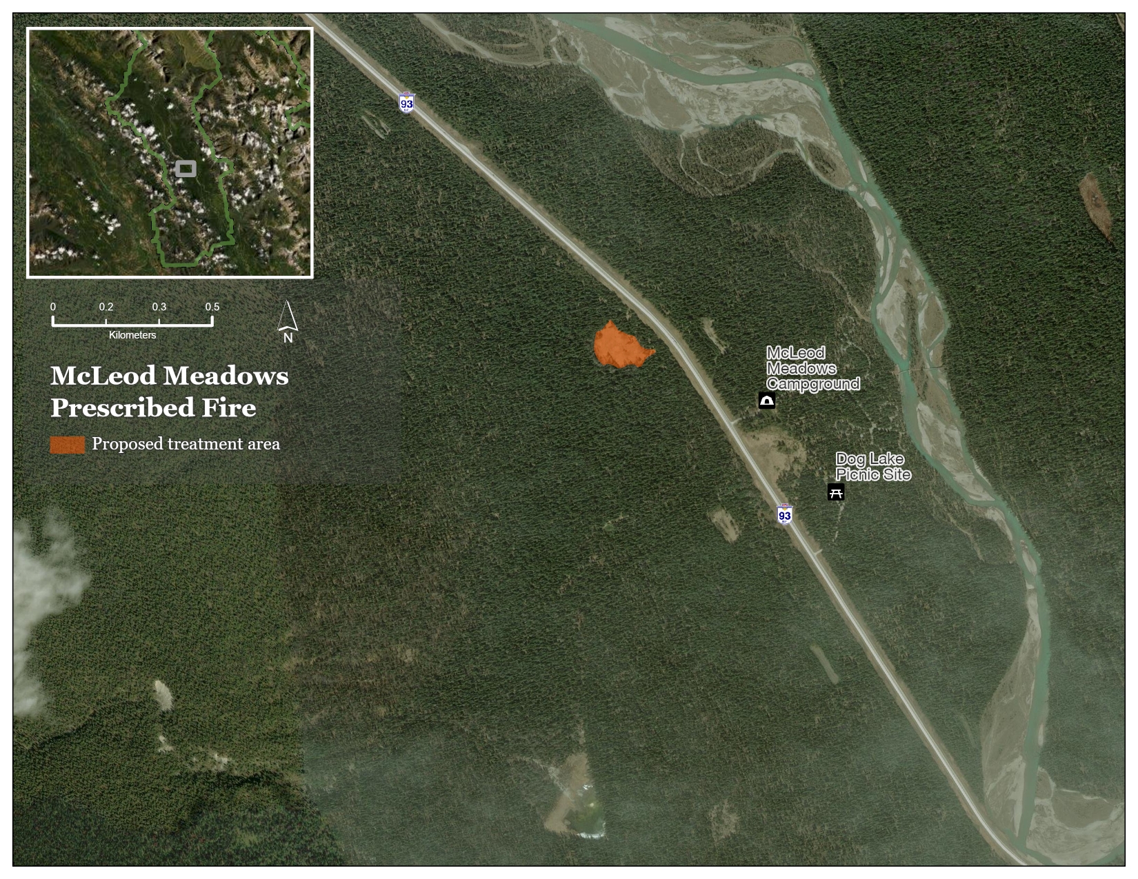 This map shows the McLeod Meadows prescribed fire area in Kootenay National Park. The main map shows a satellite-style view. It has the treatment area shown in orange near the centre of the image. The treatment area is located on the west side of Highway 93 South, close to the road. It is also close to McLeod Meadows Campground and Dog Lake Trailhead which are shown on the east side of Highway 93 South. This map shows the surrounding landscape which primarily includes a forested valley and the Kootenay River.