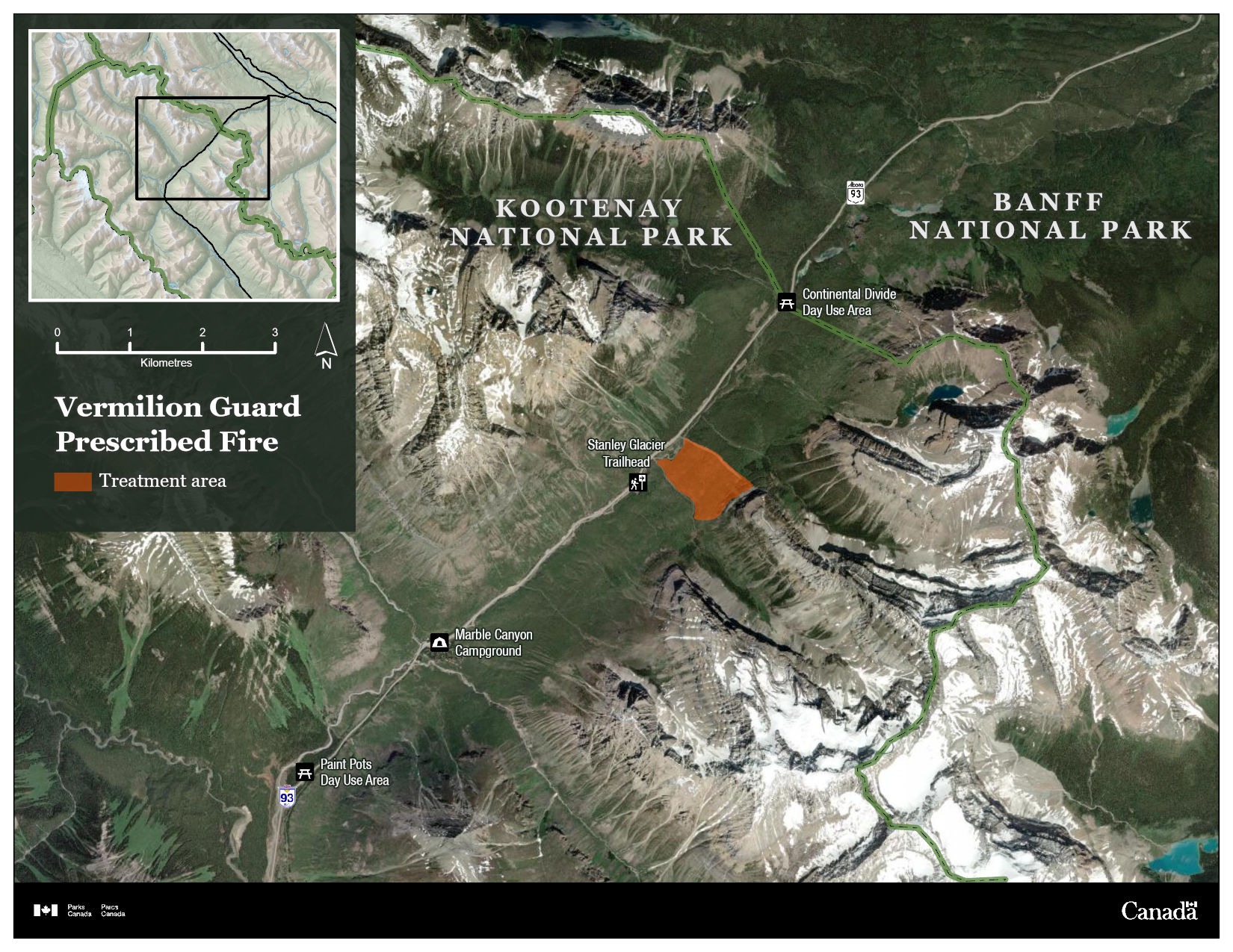 This map shows the Vermilion Guard prescribed fire area in Kootenay National Park. The main map shows a satellite-style view. It has the treatment area shown in orange near the centre of the image. It is just east of the Stanley Glacier Trailhead along Highway 93 South. In the upper right portion (northeast of the prescribed fire area), the map borders Banff National Park, with the Continental Divide Day-use Area identified near the boundary. In the lower left portion (southwest of the prescribed fire area) the map shows Marble Canyon Campground and the Paint Pots Day-use Area.